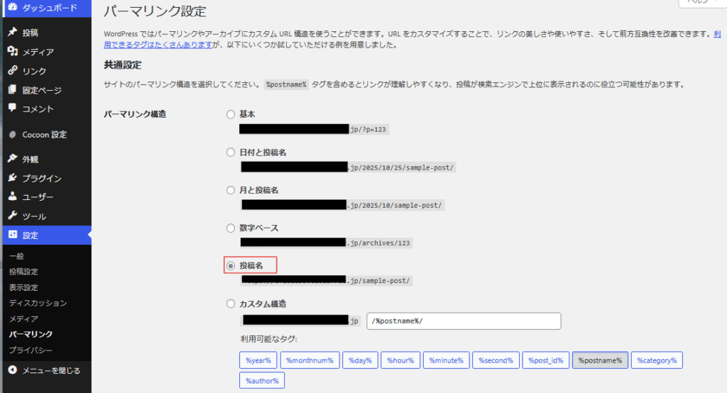 そこでパーマリンク設定を「投稿名」としました